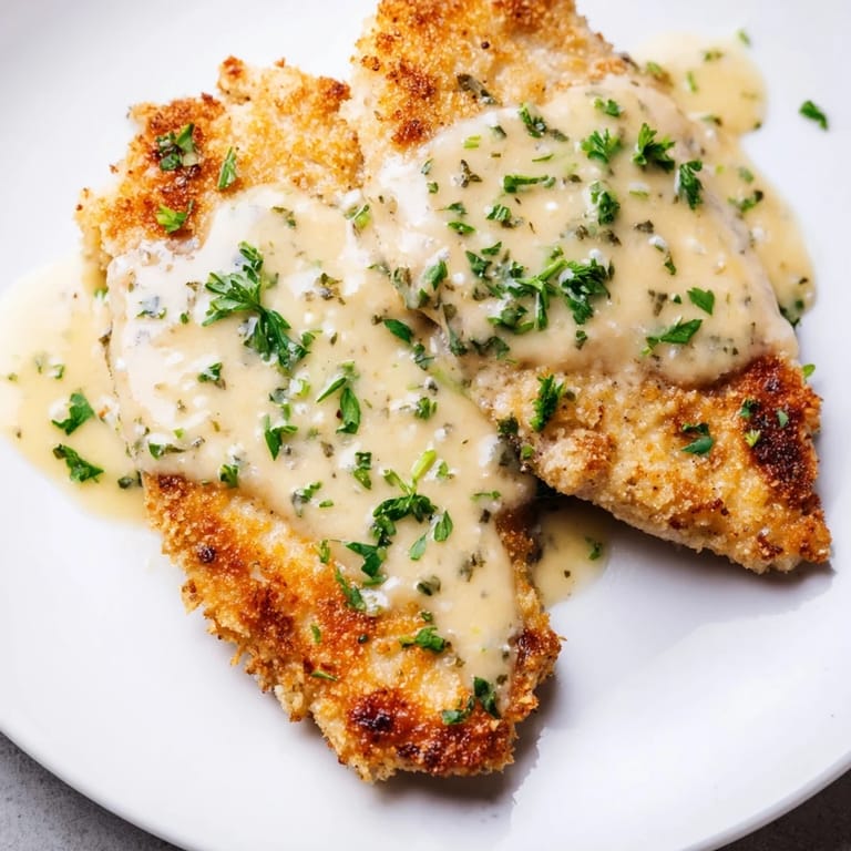 Save to Pinterest There's something about the smell of chicken crisping in hot oil that makes you feel like you've got dinner under control, even if the rest of your day has been chaos. I discovered this recipe on one of those evenings when I'd promised myself an easy weeknight but still wanted something that felt special enough to plate with care. The golden crust shatters under your fork, and then you hit that silky garlic cream sauce that catches every bit of flavor from the pan—it's the kind of dish that turns a regular Tuesday into something worth remembering.