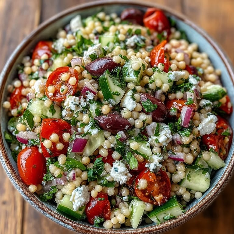 Save to Pinterest The sizzle of pearl couscous toasting in a dry pan was something I stumbled on by accident one Sunday afternoon when I forgot to boil the broth first. Instead of panicking, I let those little orbs turn golden and nutty, and it completely changed how I approached this salad. Now I can't imagine making it any other way. The crunch of cucumber against those toasted pearls, the pop of cherry tomatoes, and that salty bite of feta create a texture party that keeps you coming back for one more forkful. It's become my go-to when I need something that feels special but doesn't demand an hour of my life.