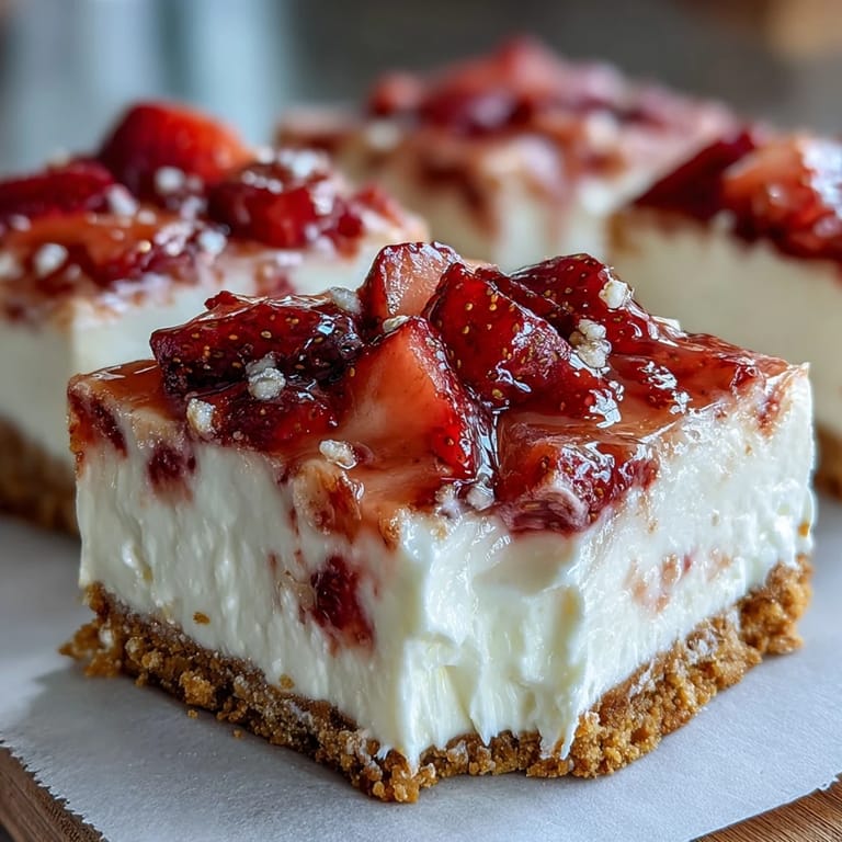 Save to Pinterest There is something quietly magical about the moment fresh strawberries meet silky cheesecake and a buttery crust. I first pulled this no-bake treat together on a hot June afternoon—windows thrown open, the distant hum of a neighbor's lawn mower wafting through the kitchen. The scent of lemon and vanilla tangling in the air marked the promise of dessert that required no oven and no stress. When the first batch disappeared before sunset, I realized I had stumbled onto something worth remembering. These Strawberry Cheesecake Bars became my not-so-secret answer to dessert emergencies all summer long.