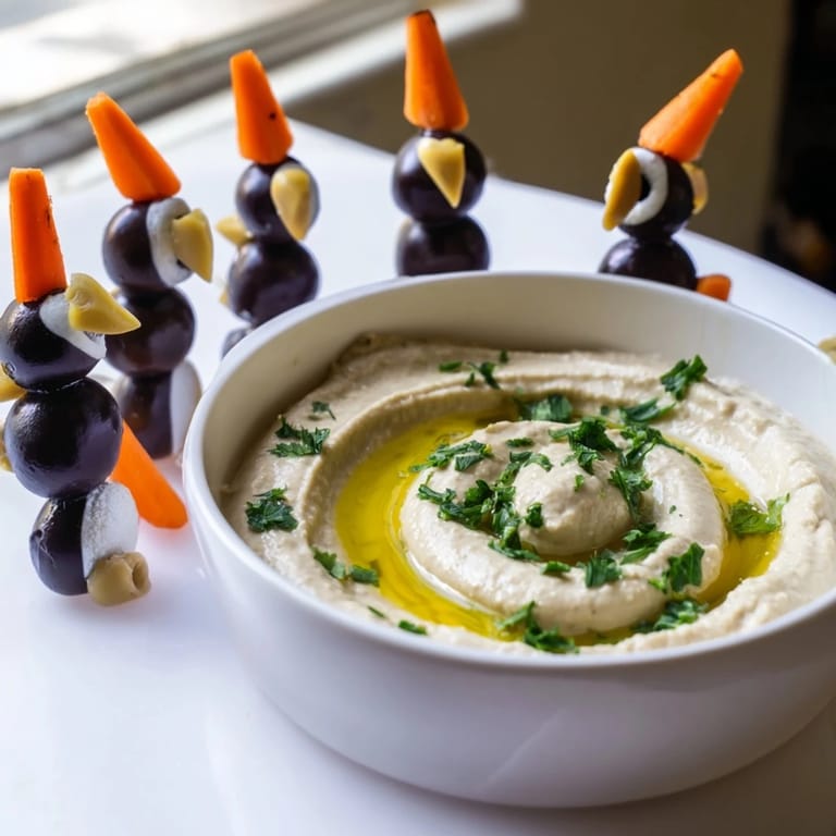 Save to Pinterest A creamy, savory white bean dip perfect for winter gatherings, adorned with adorable olive penguin decorations for a festive touch.